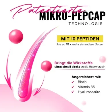 MICRO-PEPCAP-TECHNOLOGY +++ Einzigartig +++ Ganze 10 Peptide! Der Wirkstoffkomplex kombiniert pflanzliche Wachstumsfaktoren mit Coffein und nutzt eine spezielle Target Verkapselungstechnologie. Dadurch können diese Wirkstoffe effizienter zu den Haarwurzeln transportiert werden.